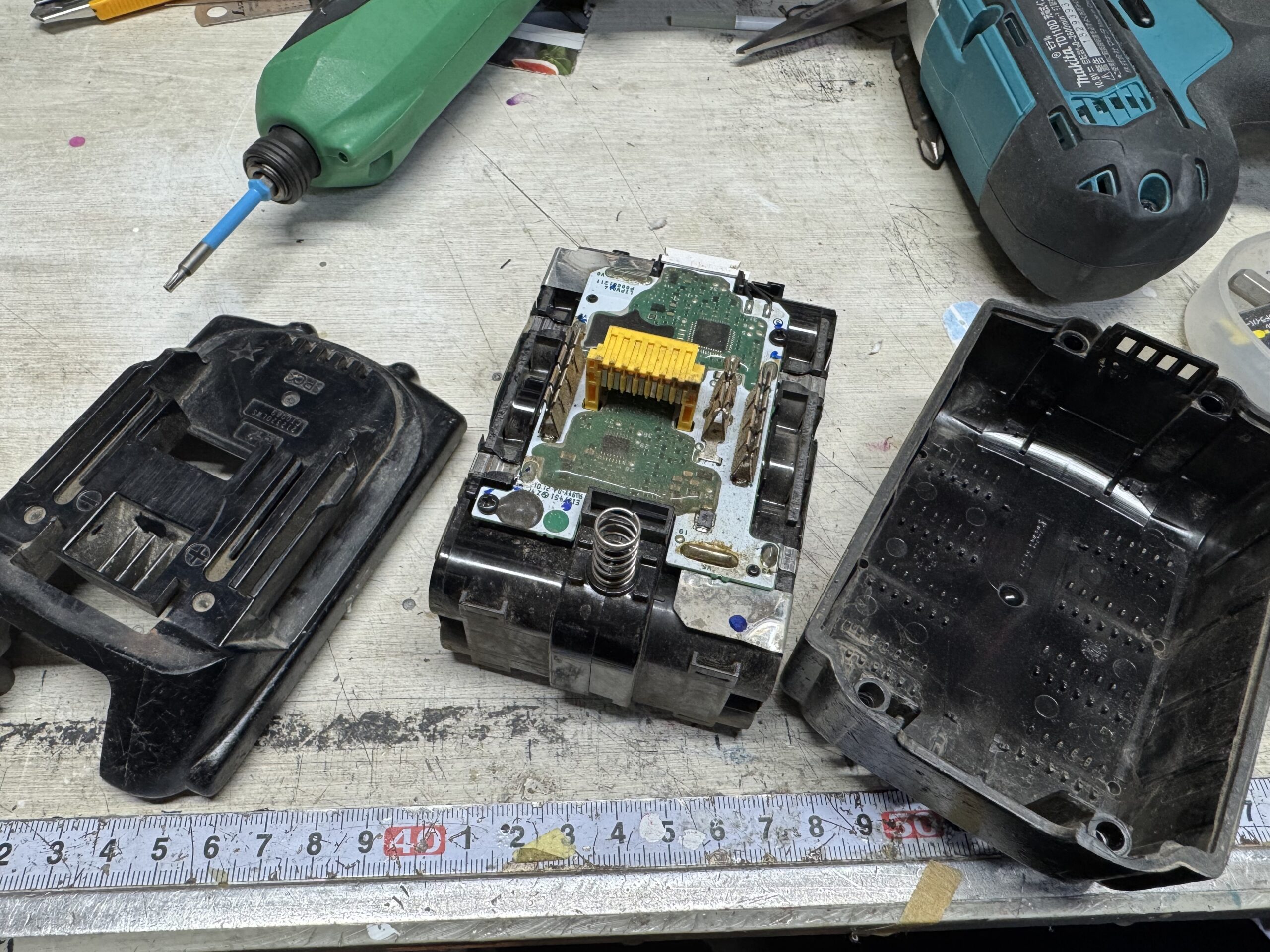 フィッシングエイト2さんのお向かいくらいにある中古工具のお店で、ほぼ新品のバッテリーとジャンクのこれを買って来て、早速分解です。