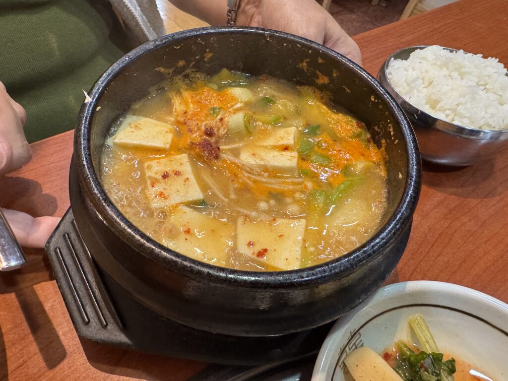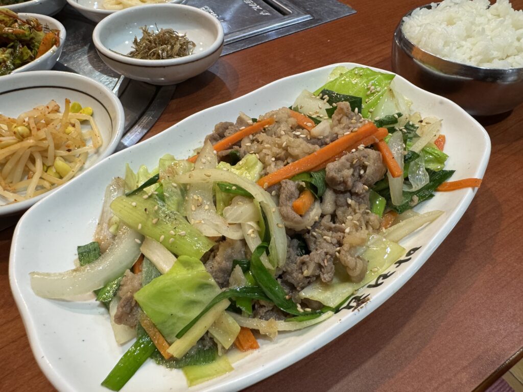 オーダーしたのはいつものプルコギ定食と味噌チゲ定食。海鮮チジミも頼んでしまったので、お腹満タン。