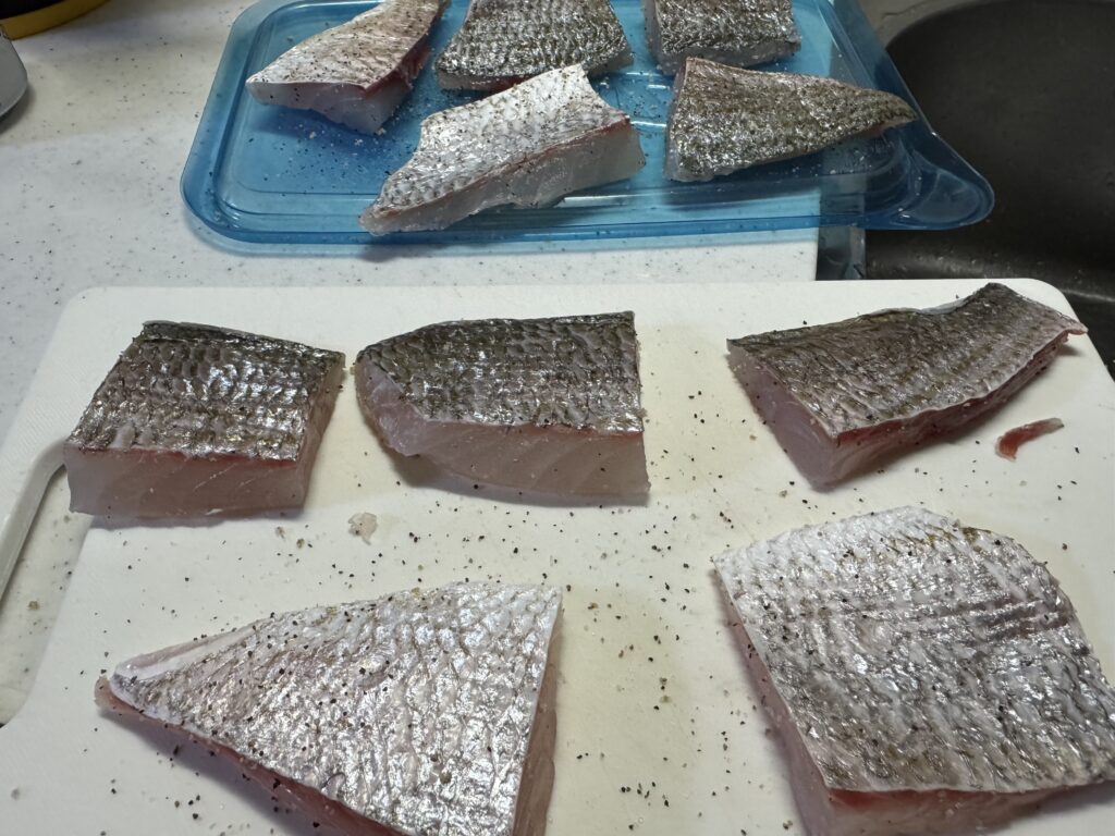 何尾か釣れたヘダイの内、持って帰ったのんは1枚だけ、。 3枚に下ろして、冷蔵庫で熟成? 食べる間がなかったのがホントのところ。 いつものようにニンニクとオリーブオイル焼き。 野菜と一緒にパクパクです。 美味しいですよ。