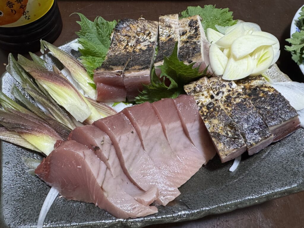 晩御飯のメインははカツオの塩たたきとお造り。 プラス高知で買ってきた野菜とで豚シャブ。 高知沖で獲れるカツオは小ぶりながら鮮度が良いので、とっても美味しかった!